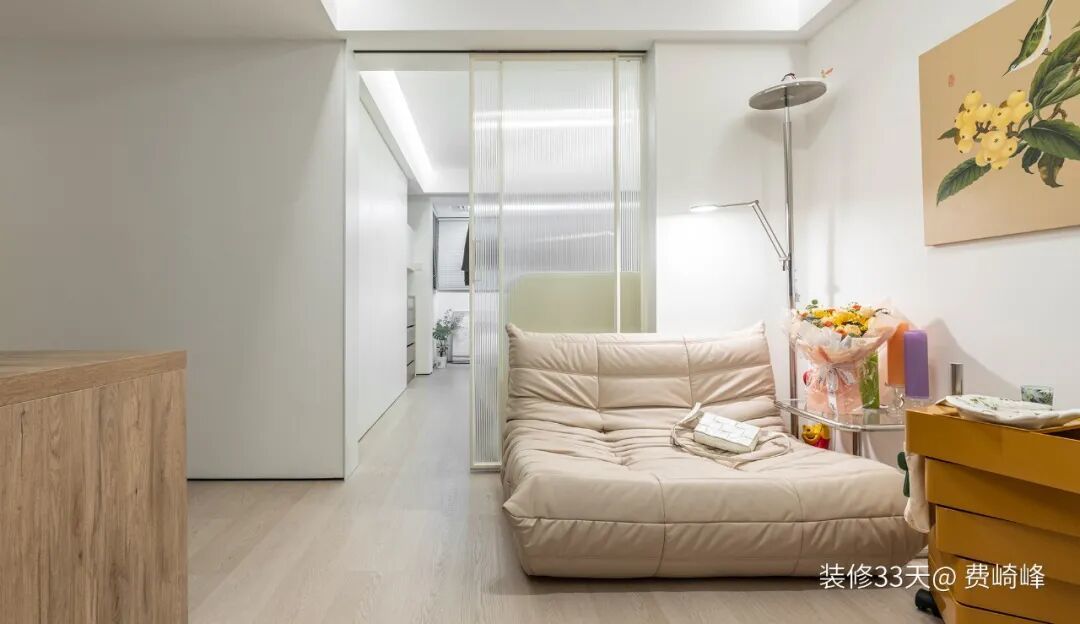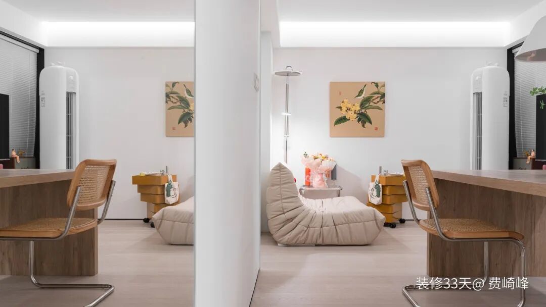 ▲ 大面积留白搭配超大懒人沙发与可移动边几,灯光与装饰画成为空间里最温柔的点睛之笔