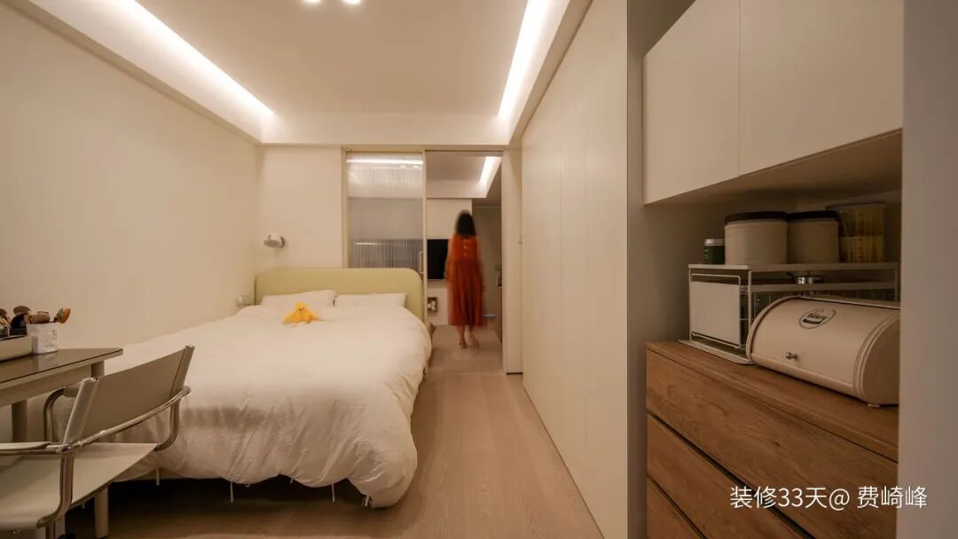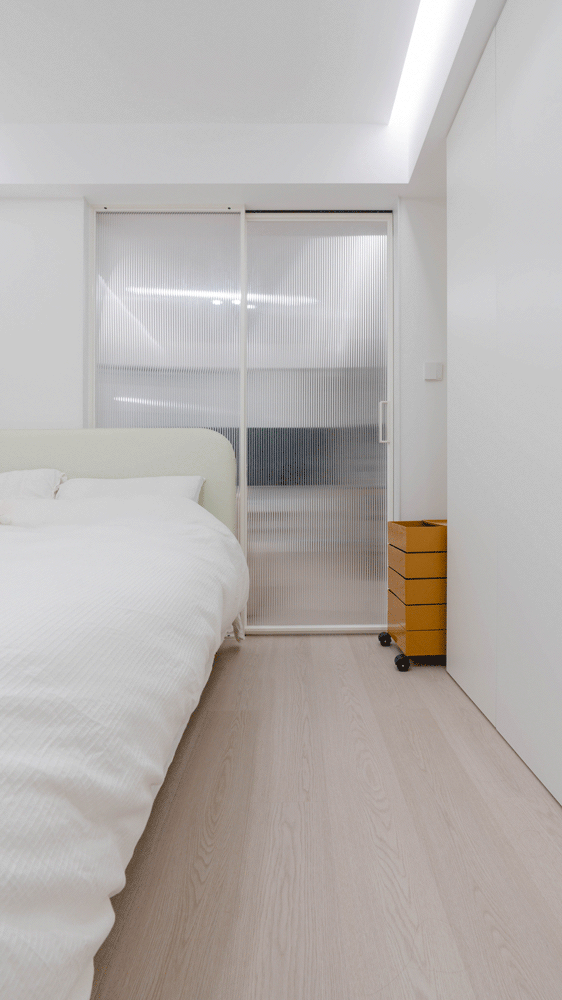 ▲ 整面墙衣柜在床头与床尾处预留留白凹槽,床头凹槽可嵌入小推车,灵活充当移动床头柜